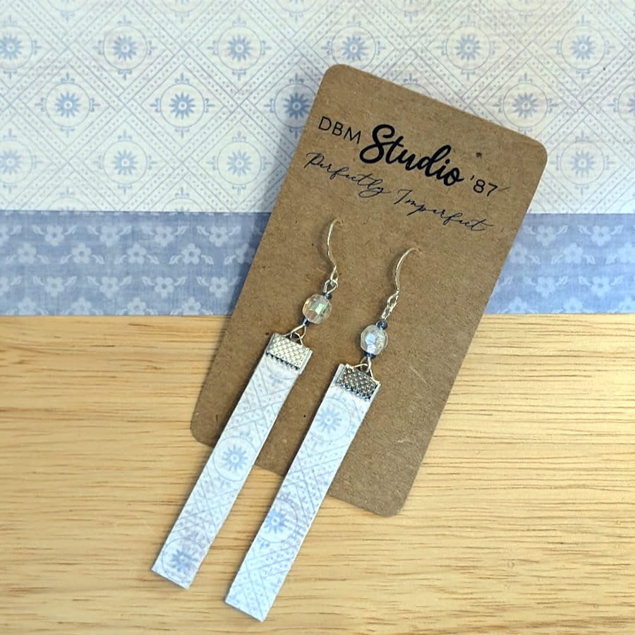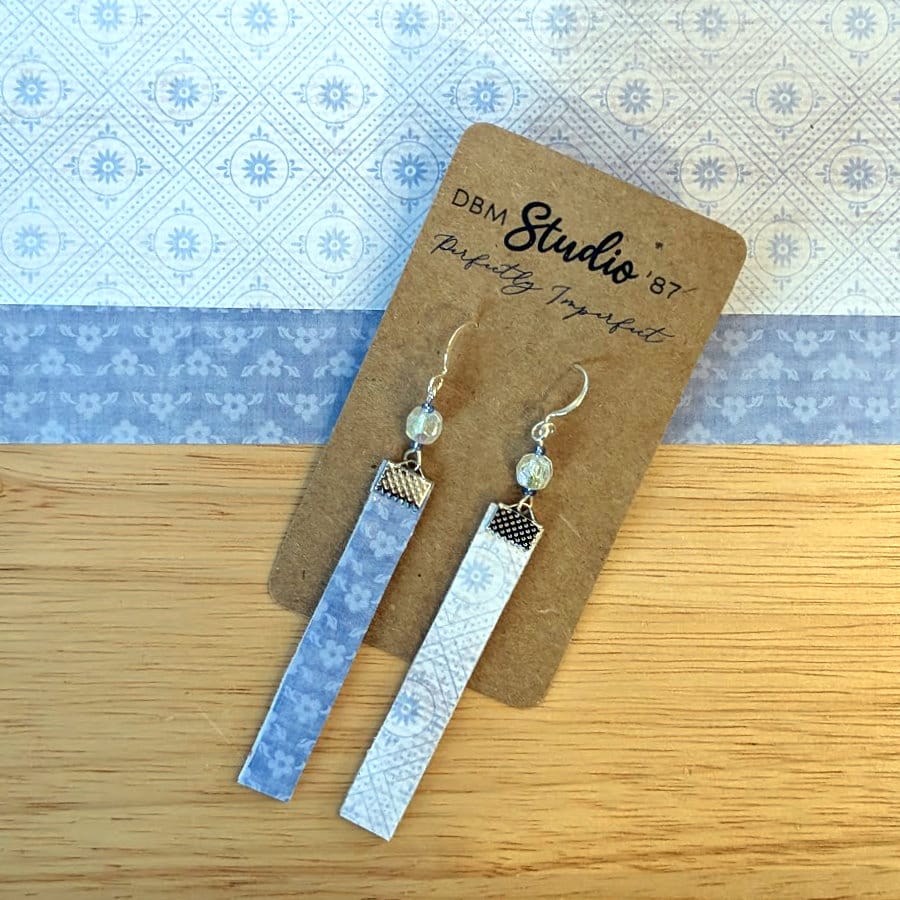 Showcase your individuality with our thin rectangle scrapbook paper earrings. Crafted from Mod Podged scrapbook paper, these lightweight accessories feature a felt core for added durability and comfort. The silver metal accents and blue sparkly beads create a harmonious blend of elegance and charm, making them perfect for any occasion.