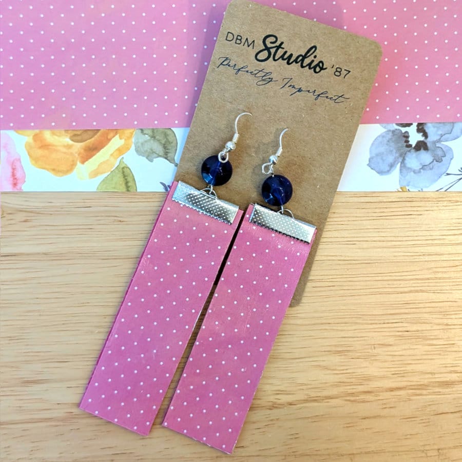 What makes these earrings truly unique is their scrapbook-inspired design. The paper front showcases a floral pattern on a pristine white background, while the back features a charming pink and white polkadot print. Together, these elements bring a playful yet sophisticated vibe to your accessory collection.