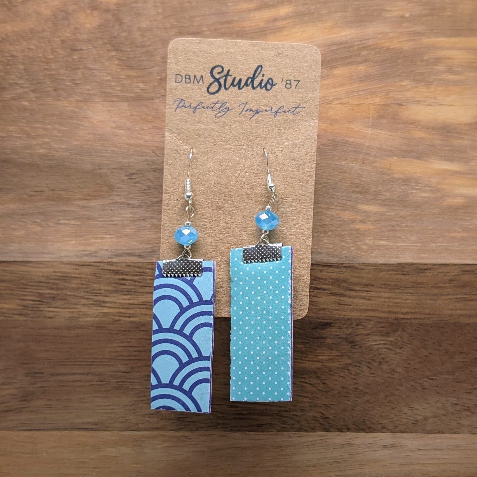 The front of the earrings boasts a beautiful light blue pattern with elegant purple swirls, while the back is adorned with light blue polka dots for a playful touch. The combination of light blue and purple creates a harmonious blend of colors, making these earrings irresistibly stylish and versatile.