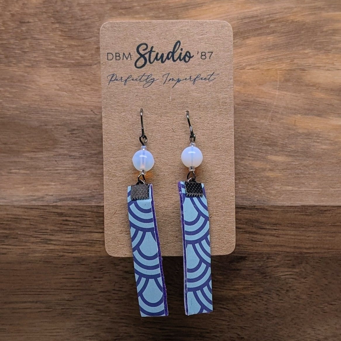 The front of each earring boasts a light blue base adorned with elegant purple swirls, adding a touch of whimsy and sophistication. On the reverse side, you’ll find playful light blue polka dots for added charm, offering two unique looks in one accessory.