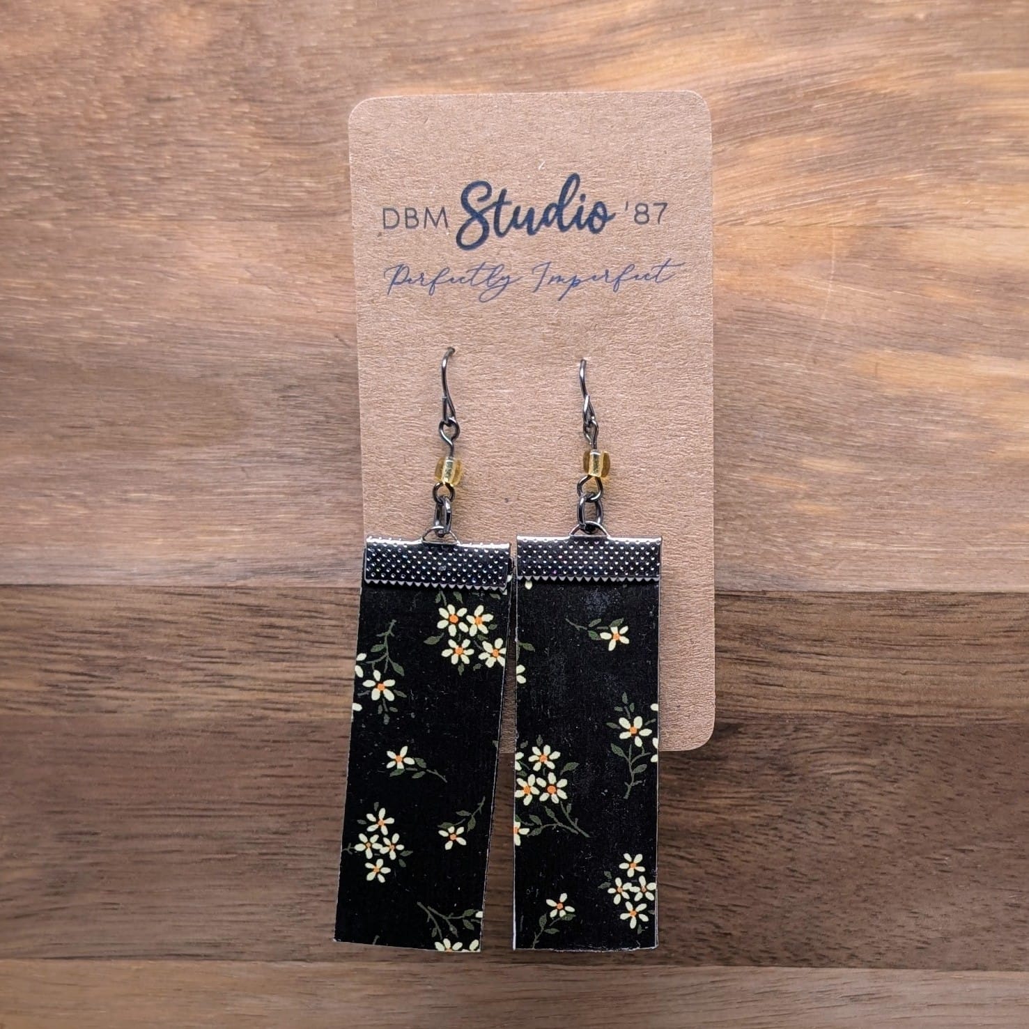 Discover the beauty of our medium rectangle scrapbook paper earrings, designed with a felt core for durability and creativity. The front showcases a stunning black background adorned with delicate yellow flowers, while the back features a vibrant yellow with golden yellow circle for a bold and versatile look.