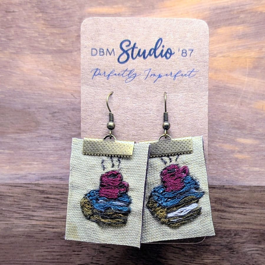 These square embroidered earrings are a perfect blend of charm and creativity. The front showcases a beautifully embroidered coffee cup resting on a stack of books, making these earrings a must-have for avid readers and coffee enthusiasts alike.