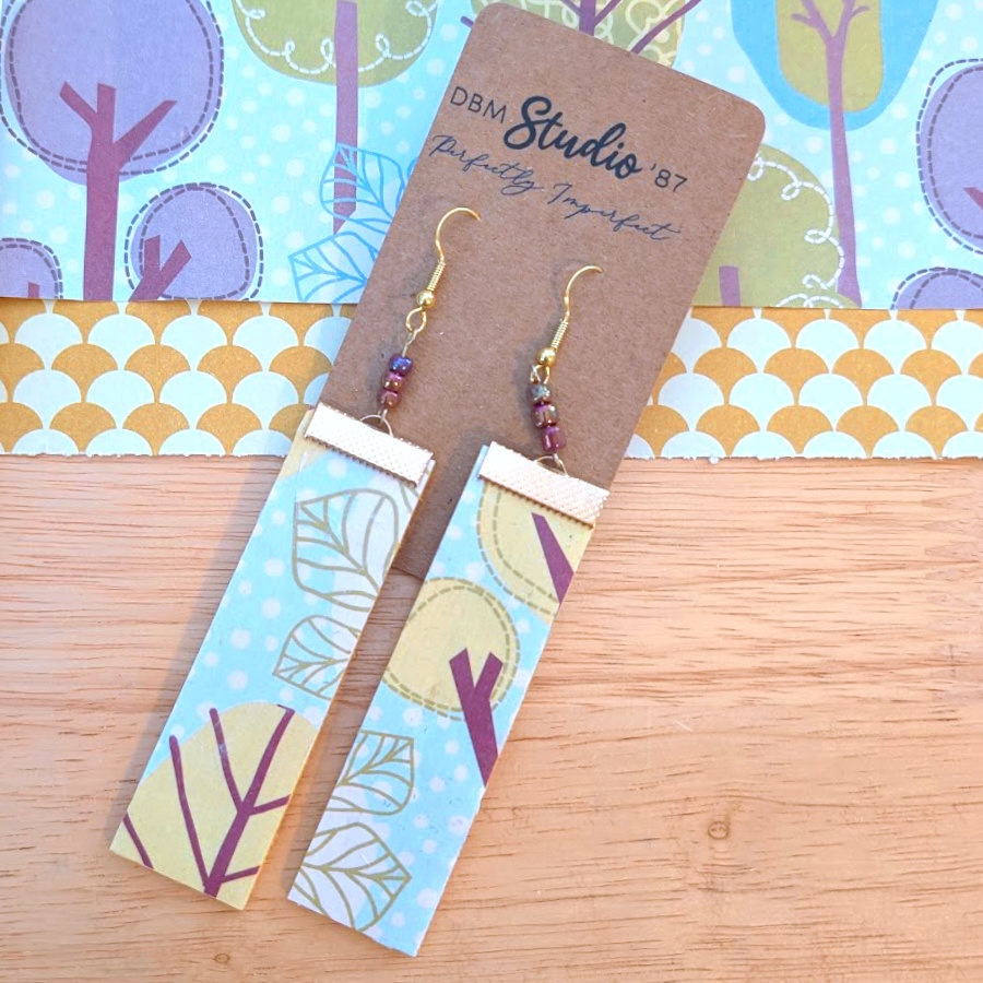 These lightweight, handcrafted rectangle earrings feature gold accents, iridescent purple‑blue beads, and a mix of light‑blue tree motifs with a gold‑yellow fan pattern for a unique, artistic look. Their felt‑core, Mod Podge–sealed construction keeps them comfortable for all‑day wear while adding a touch of handmade elegance to any outfit.
