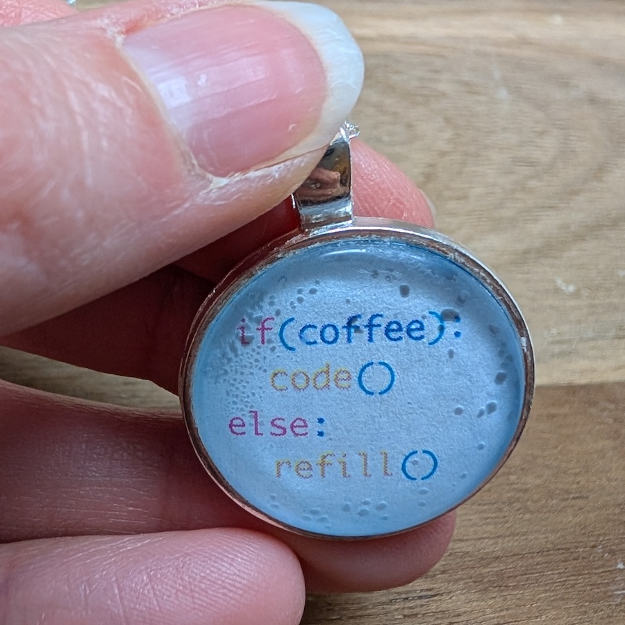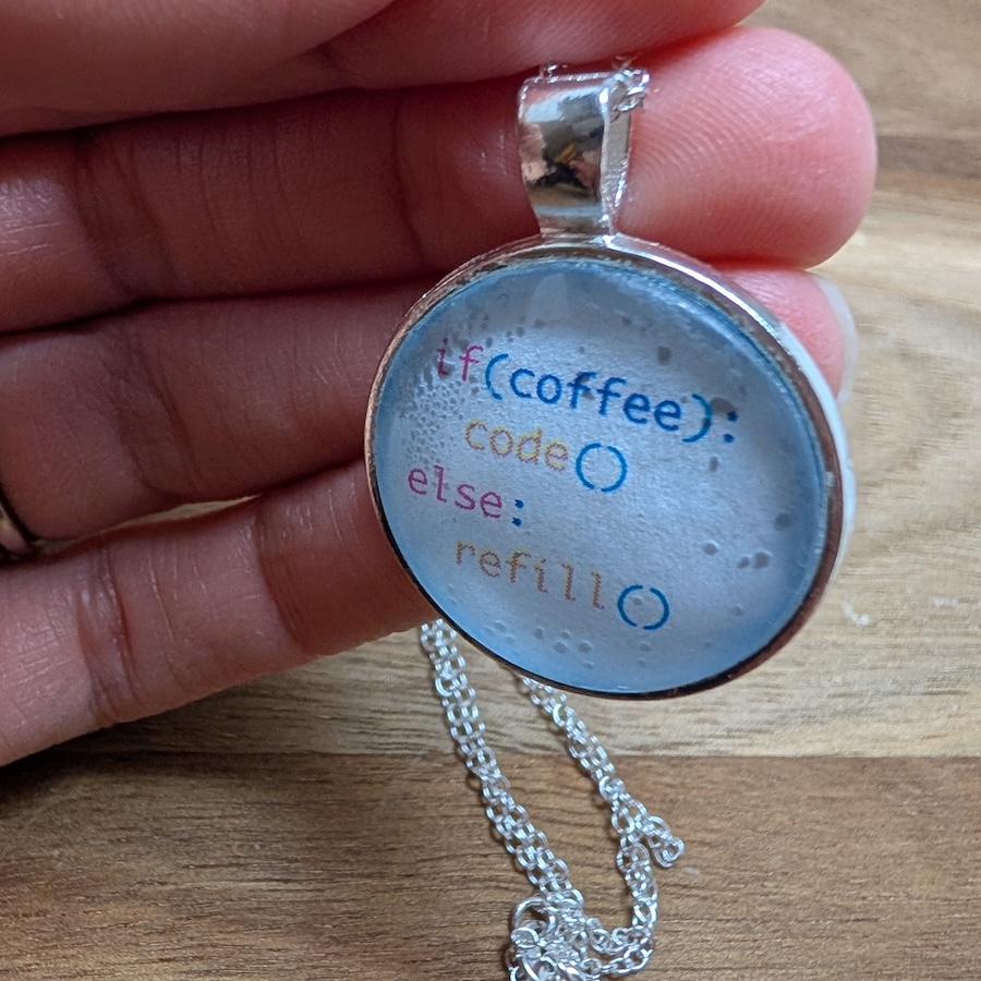 This 25 mm round glass cabochon necklace features a crisp printed design that reads “if (coffee) code () else: refill ()”—perfect for coffee loving coders. The artwork sits beneath a glossy glass dome, set securely in a stainless steel bezel for durability and everyday wear. It hangs from an 18‑inch sterling‑silver–plated chain with a reliable lobster clasp, giving the piece a clean, modern shine. Lightweight, charming, and full of personality, it’s the perfect accessory for coffee drinking programmers, and anyone who enjoys a little warmth and whimsy in their day.