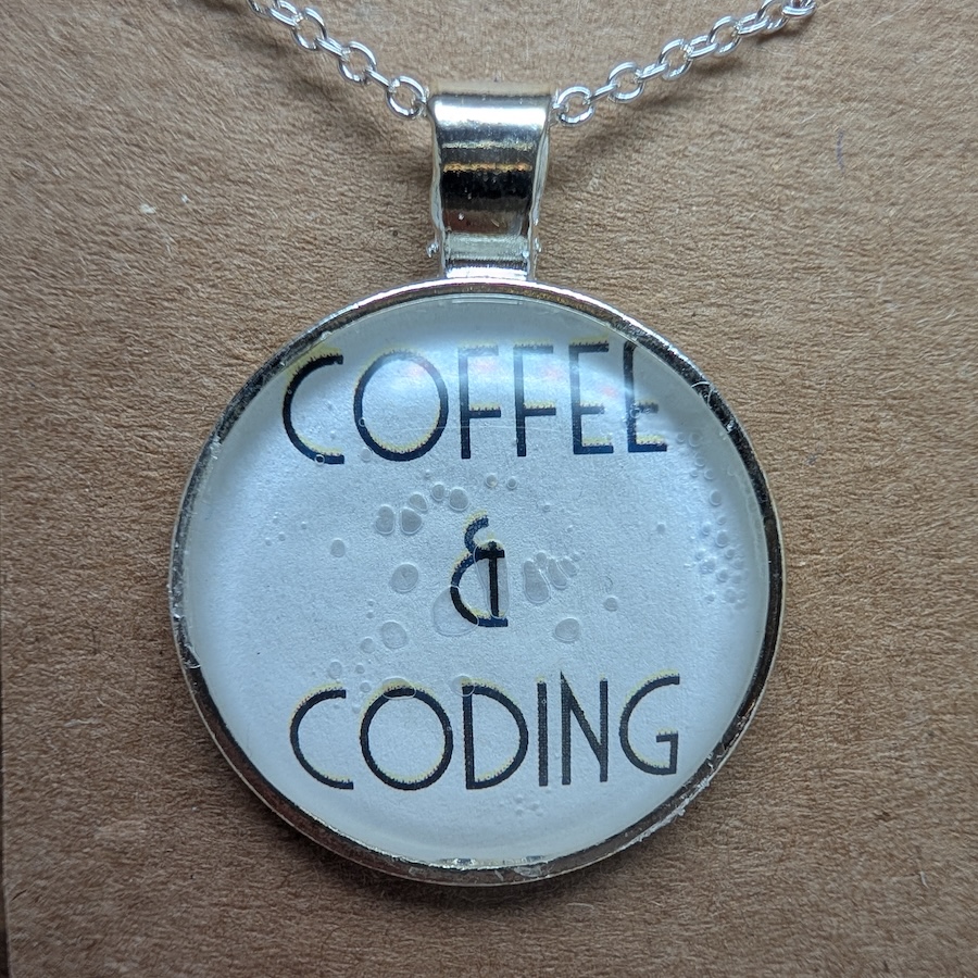This 25 mm round glass cabochon necklace features a crisp printed design that reads “Coffee & Coding." The artwork sits beneath a glossy glass dome, set securely in a stainless steel bezel for durability and everyday wear. It hangs from an 18‑inch sterling‑silver–plated chain with a reliable lobster clasp, giving the piece a clean, modern shine. Lightweight, charming, and full of personality, it’s the perfect accessory for latte lovers, bookish souls, and anyone who enjoys a little warmth and whimsy in their day.