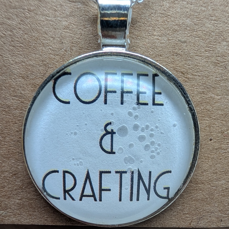 This 25 mm round glass cabochon necklace features a crisp printed design that reads “Coffee & Crafting. The artwork sits beneath a glossy glass dome, set securely in a stainless steel bezel for durability and everyday wear. It hangs from an 18‑inch sterling‑silver–plated chain with a reliable lobster clasp, giving the piece a clean, modern shine. Lightweight, charming, and full of personality, it’s the perfect accessory for latte lovers, bookish souls, and anyone who enjoys a little warmth and whimsy in their day.