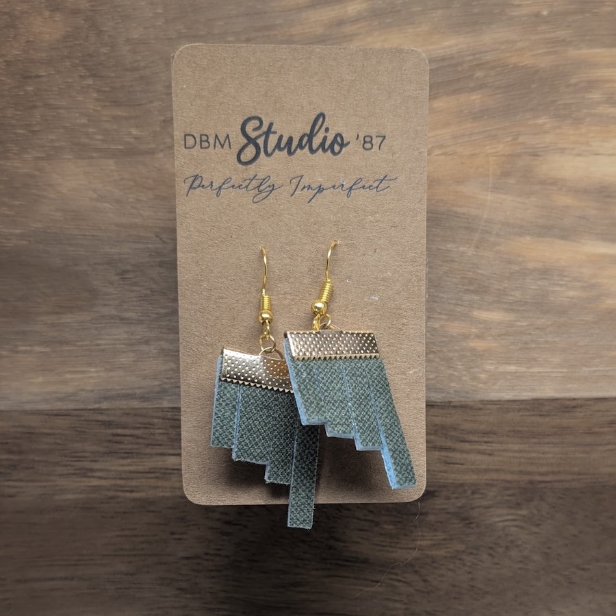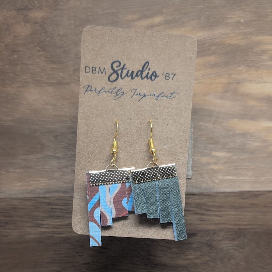 These lightweight earrings are crafted from the rescued end‑bits of my paper designs — tiny strips that would’ve been tossed, now transformed into wearable art. Each pair features four staggered lengths of brown‑and‑blue swirled paper with a soft felt core, sealed in Mod Podge for durability, and finished with a deep green fabric backing. Gold findings add a warm touch, making these perfectly imperfect little treasures an affordable way to enjoy the scraps from my studio.