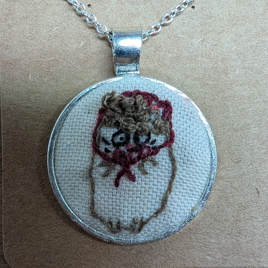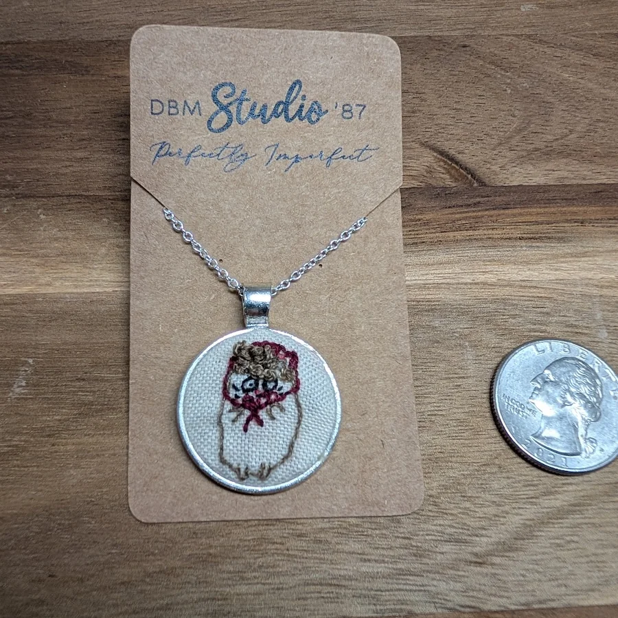 This piece is a tiny embroidered tribute to Gammy Sweet Cheeks. Each pendant is hand‑stitched, framed, and finished by me in my Perfectly Imperfect style. 20 mm diameter stainless steel setting. Lightweight and finished with Fray Check*. Made with love for fellow Gammy Sweet Cheeks fans. Necklace is sterling silver plated 18 inches.
