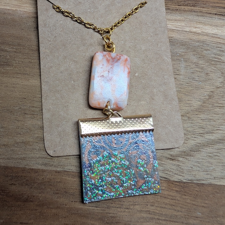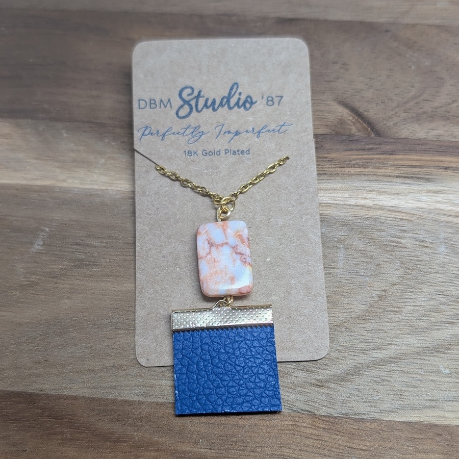This 18 inch necklace features a delicate 18k gold chain paired with a glitter storybook inspired scrapbook paper front and a blue faux leather back showcasing a marbled stone.