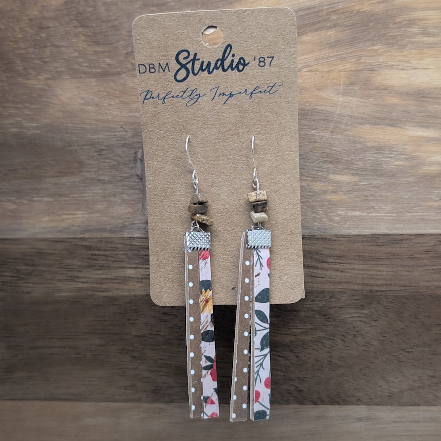 These lightweight earrings pair brown stone beads with split‑pattern scrapbook paper panels built on a soft felt core. One side features warm brown with crisp white polka dots, while the other shows a light pink floral print with red and green accents. Finished with silver‑tone findings, they bring a sweet, mismatched in the best way charm to everyday outfits.