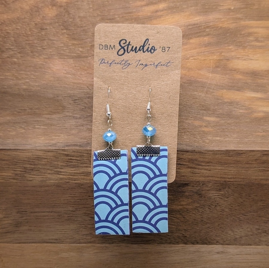 These medium‑length rectangular scrapbook earrings feature a purple felt core, light blue fronts with purple swirls, light blue polka‑dot backs, and coordinating light blue pearl‑style beads with pewter‑toned metals, with both sides shown.