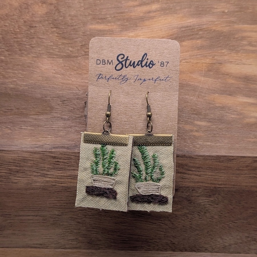 These handcrafted rectangle earrings feature intricate potted‑plant embroidery, a felt core with forest‑green pleather backing, and bronze finishes for a lightweight, artistic accessory with elegant, durable charm.