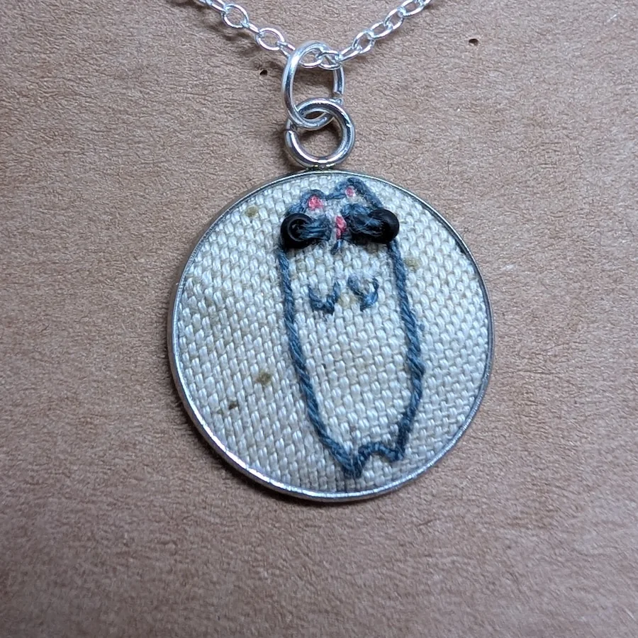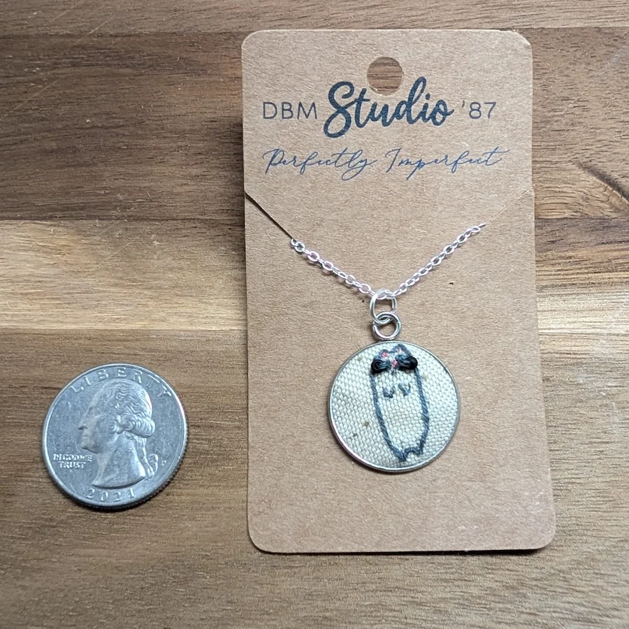 This piece is a tiny embroidered tribute to Lord Gerkin. Each pendant is hand‑stitched, framed, and finished by me in my Perfectly Imperfect style. 20 mm diameter stainless steel setting. Lightweight and finished with Fray Check*. Made with love for fellow Jeffrey fans. Necklace is sterling silver plated 18 inches.