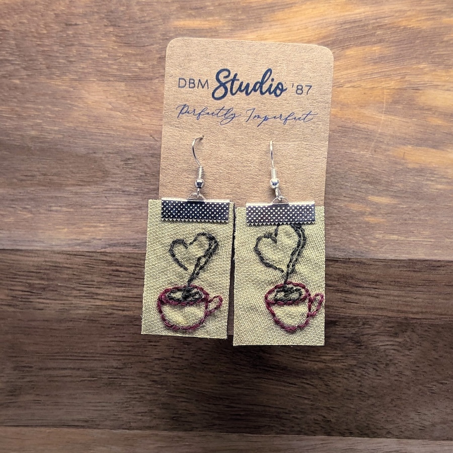 These rectangle hand embroidered earrings feature a sweet little coffee cup with a steaming heart stitched on the front, giving them a charming, cozy café feel. The center is softly padded with felt for structure, and the back is finished with rich faux maroon leather for a clean, polished look. Silver tone findings complements the warm, handcrafted details. Lightweight, unique, and full of personality, they’re a perfect everyday pair for coffee lovers and anyone who enjoys a touch of stitched sweetness in their style.