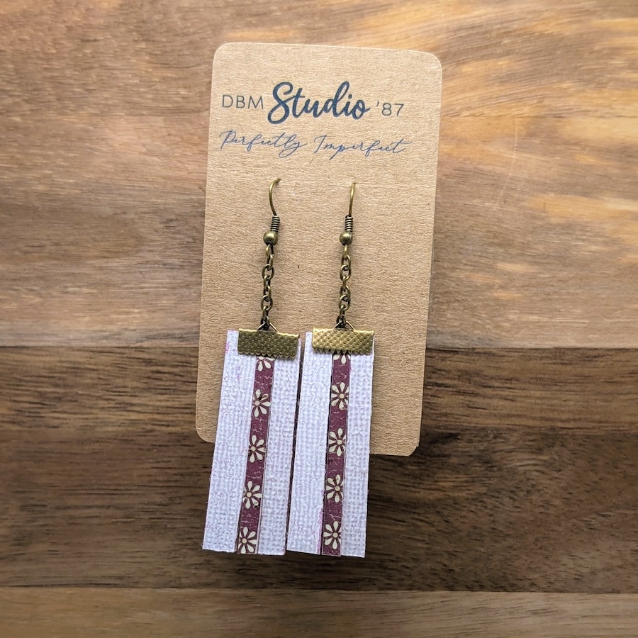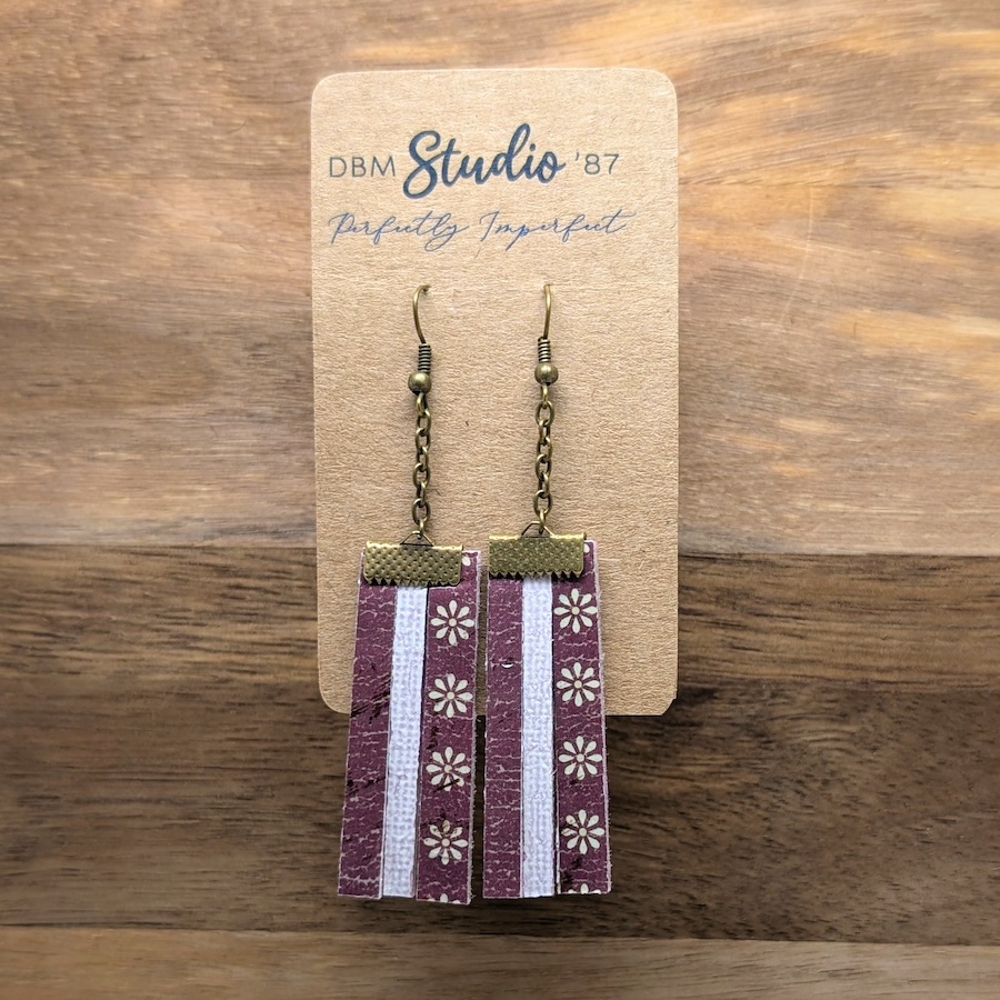 These three layer rectangle scrapbook paper earrings feature a mix of maroon and off white daisies paired with soft purple textured accents for a rich, artistic look. Each piece is built with a felt core for strength and sealed for durability, keeping them lightweight and comfortable for all day wear. Antique bronze findings and a delicate matching chain add a warm, vintage touch that complements the layered design beautifully. Unique, airy, and full of handcrafted charm, they make a lovely statement for anyone who enjoys floral details with an earthy, elegant feel.