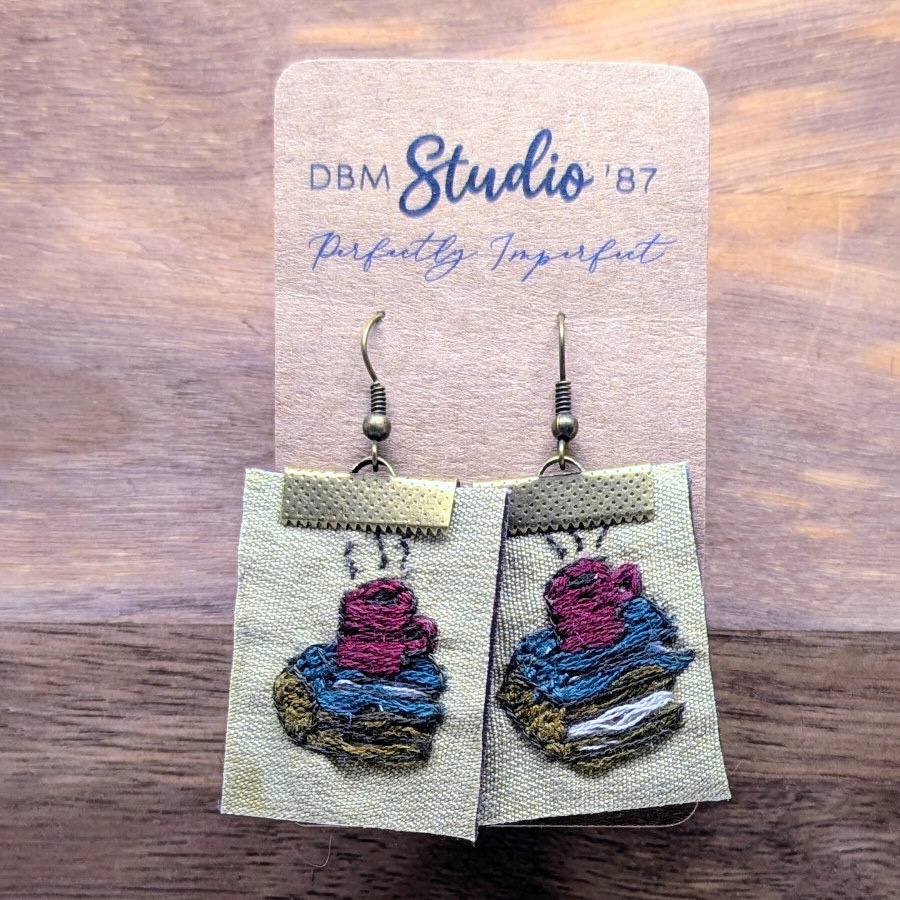 These square embroidered earrings feature a coffee cup on books design, maroon faux leather backs, and a felt core sealed for durability, creating a lightweight and stylish accessory for book and coffee lovers.