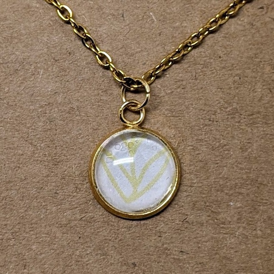 This 18 inch necklace features a delicate 18k gold chain paired with a 12 mm gold plated pendant showcasing a light green floral design on a clean white background. The glossy finish highlights the soft colors and gives the piece a fresh, refined look. Lightweight, feminine, and easy to style, it adds a subtle touch of spring to any outfit and makes a lovely everyday accessory or gift.