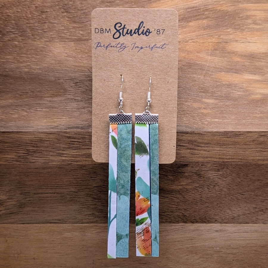 These long split‑design earrings combine two floral moods in one lightweight pair. One half features bright orange and green florals on a crisp white background, while the other half showcases medium‑blue florals on a matching blue base. The contrast feels fresh and artistic, and the silver finishes keep the look clean and modern. Made from layered scrapbook paper and felt, they’re comfortable for all‑day wear and bring a bold, colorful touch to any outfit.