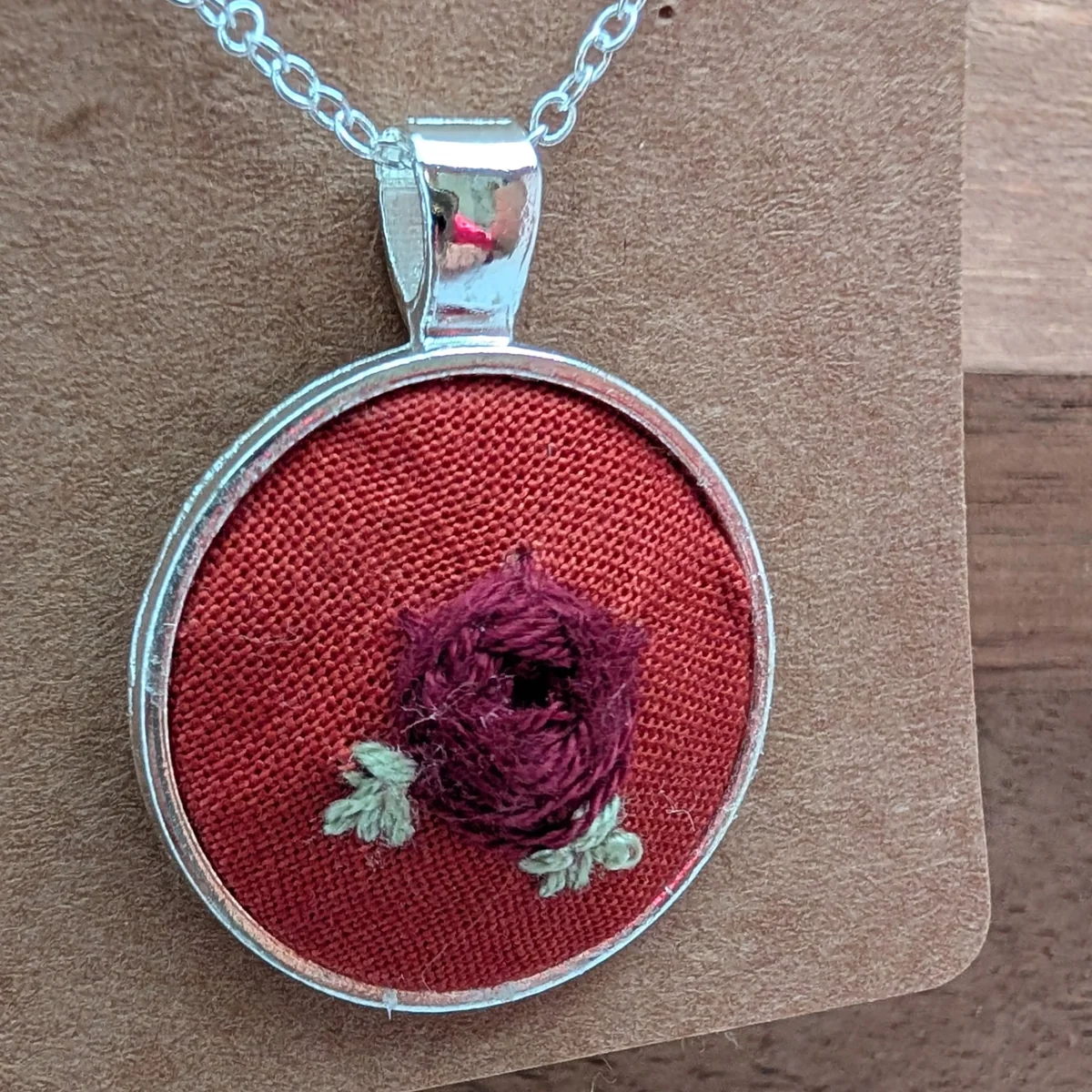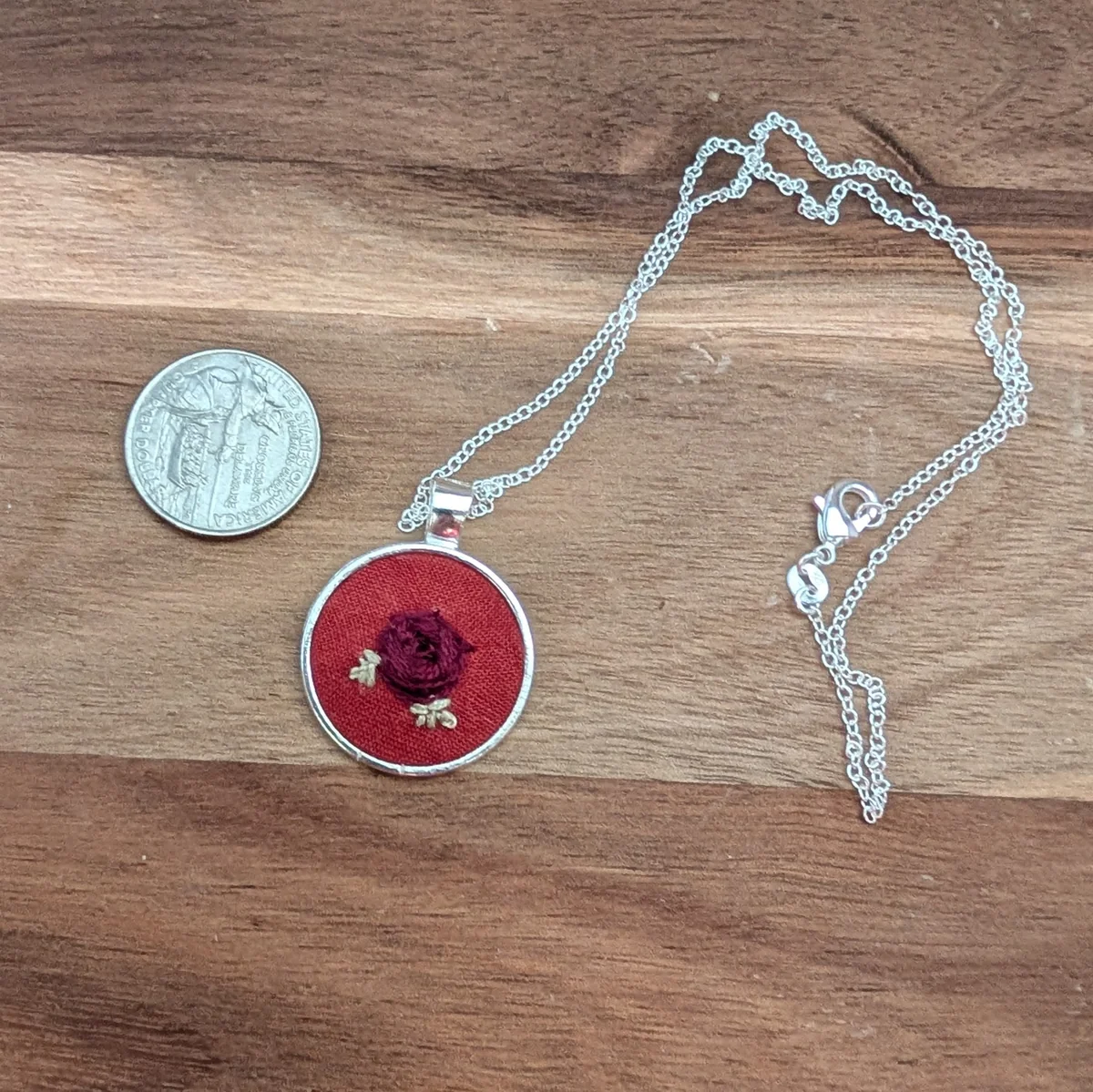 This embroidered pendant features an intricate maroon red rose on a reddish orange fabric embroidery, silver-tone back, sterling silver coated 18 inch chain with lobster clasp.