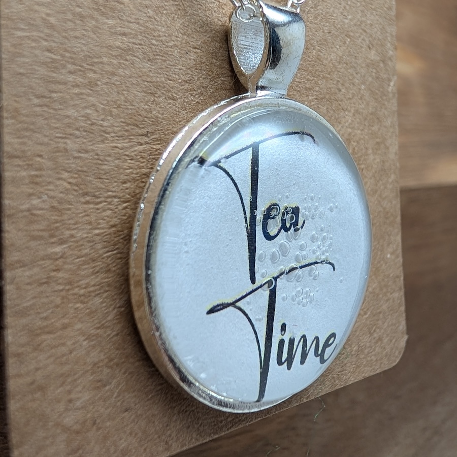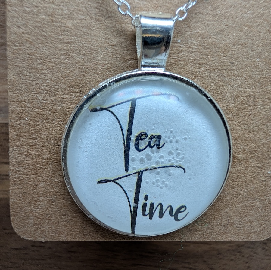 This 25 mm round glass cabochon necklace features a crisp printed design that reads “Tea Time”. The artwork sits beneath a glossy glass dome, set securely in a stainless steel bezel for durability and everyday wear. It hangs from an 18‑inch sterling‑silver–plated chain with a reliable lobster clasp, giving the piece a clean, modern shine. Lightweight, charming, and full of personality, it’s the perfect accessory for latte lovers, bookish souls, and anyone who enjoys a little warmth and whimsy in their day.